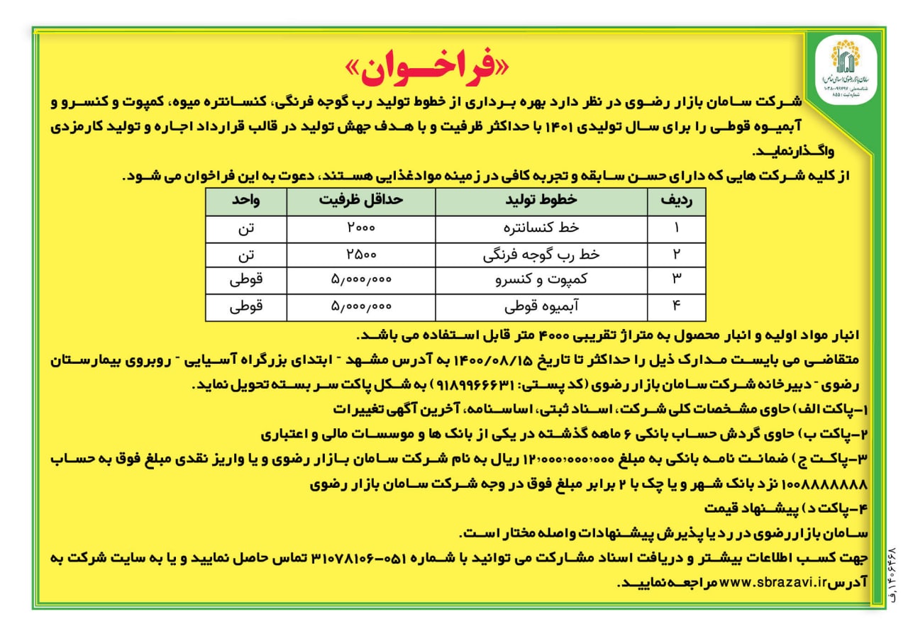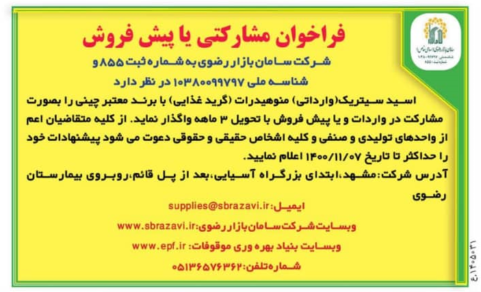 شرکت سامان بازار رضوي به شماره ثبت 855 و شناسه ملي 10380099797 در نظر دارد اسيد سيتريک(وارداتي) منوهيدرات (گريد غذايي) با برند معتبر چيني را بصورت مشارکت در واردات و يا پيش فروش با تحويل 3 ماهه واگذار نمايد. از کليه متقاضيان اعم از واحدهاي توليدي و صنفي و کليه اشخاص حقيقي و حقوقي دعوت مي شود پيشنهادات خود را حداکثر تا تاريخ 07/11/1400 اعلام نماييد.